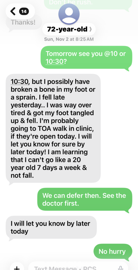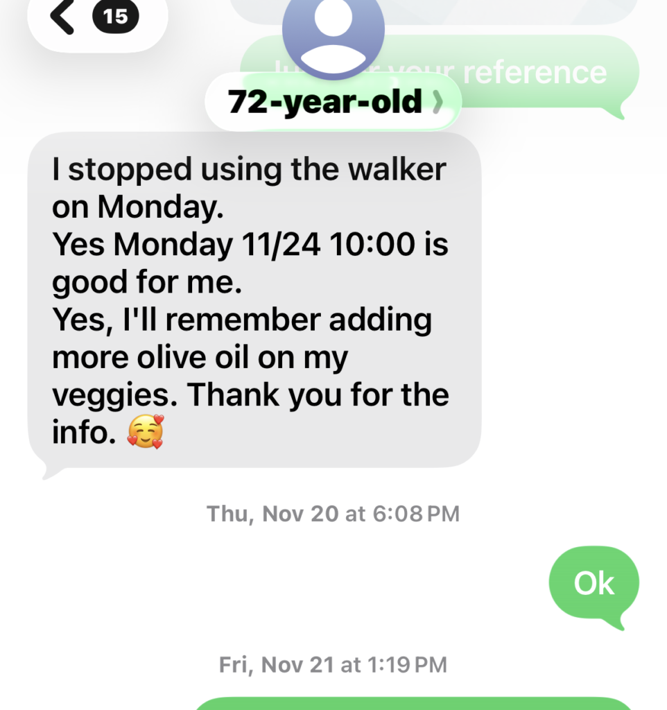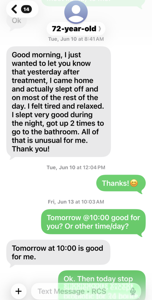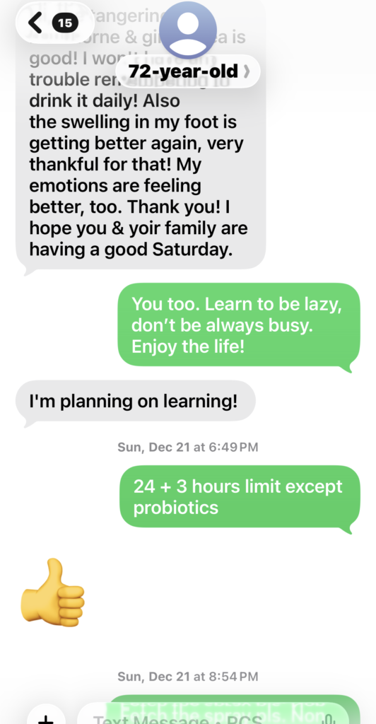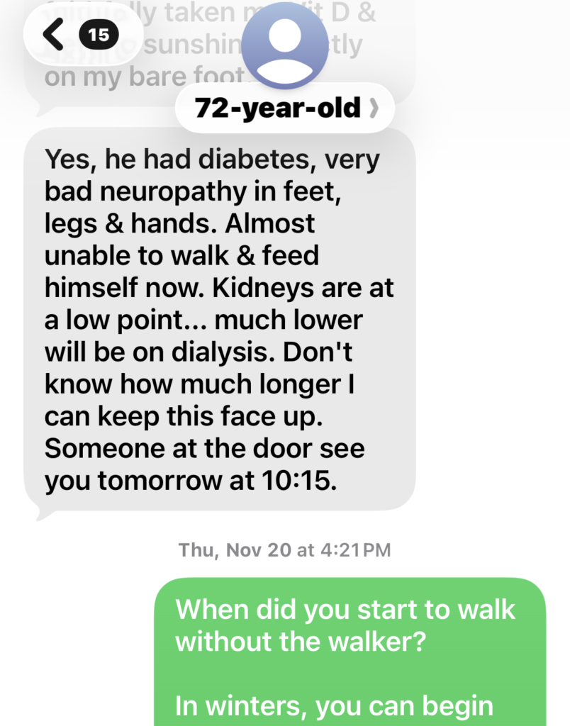 Unluckily, during our program, she ever fell down twice due to her unbalanced quick walking paces resulting from long-time hip dislocation gesture. The 1st time trip (8/31/25) made her get some bruises/ puffiness; the 2nd time’s trip (11/01/25) made her left foot bone’s fracture. Luckily without chronic inflammation’s bad working in her body, her body healed them quickly without any medical helps. On 11/10/25, I specially did acute trama portocols for her fractured bone. Then on 11/12/25, she felt her foot much better. On 11/17/25 just within 17 days after the bone’s fracture, she could walk without walker.