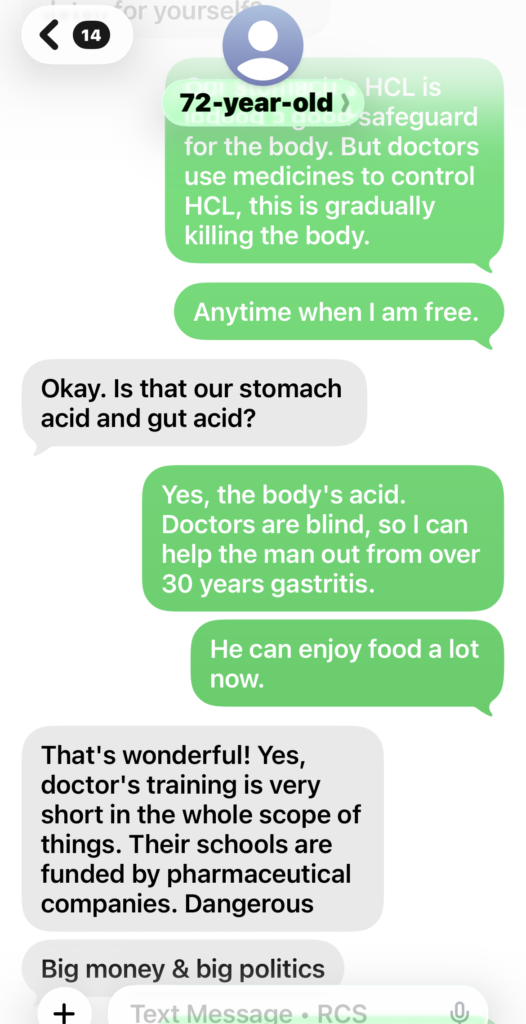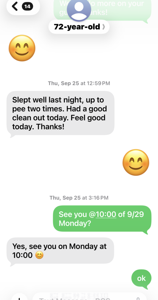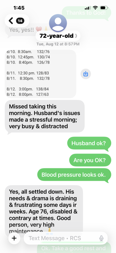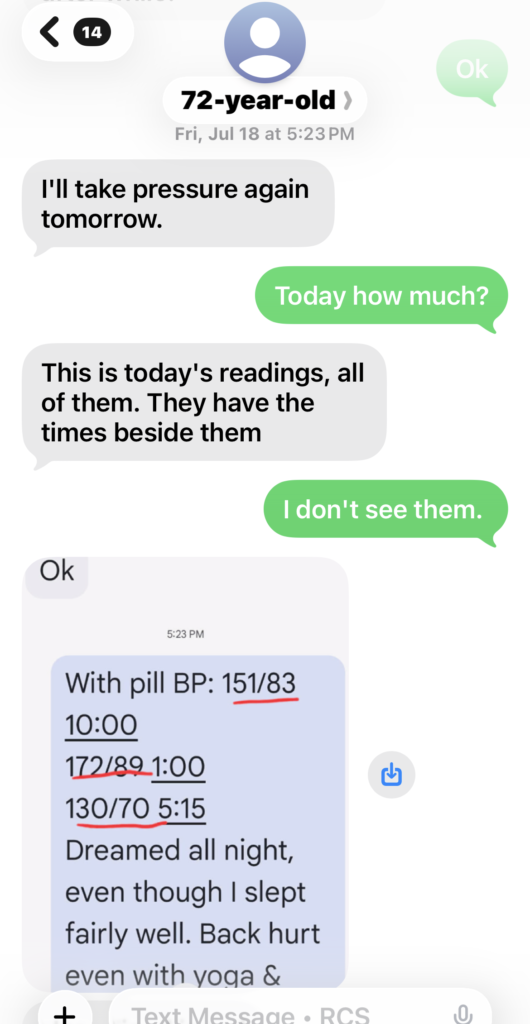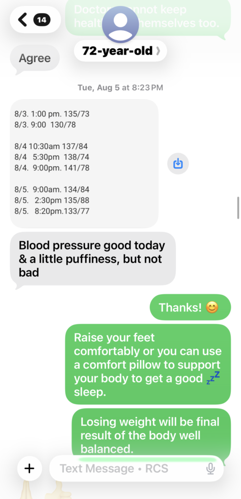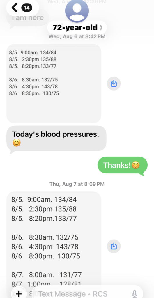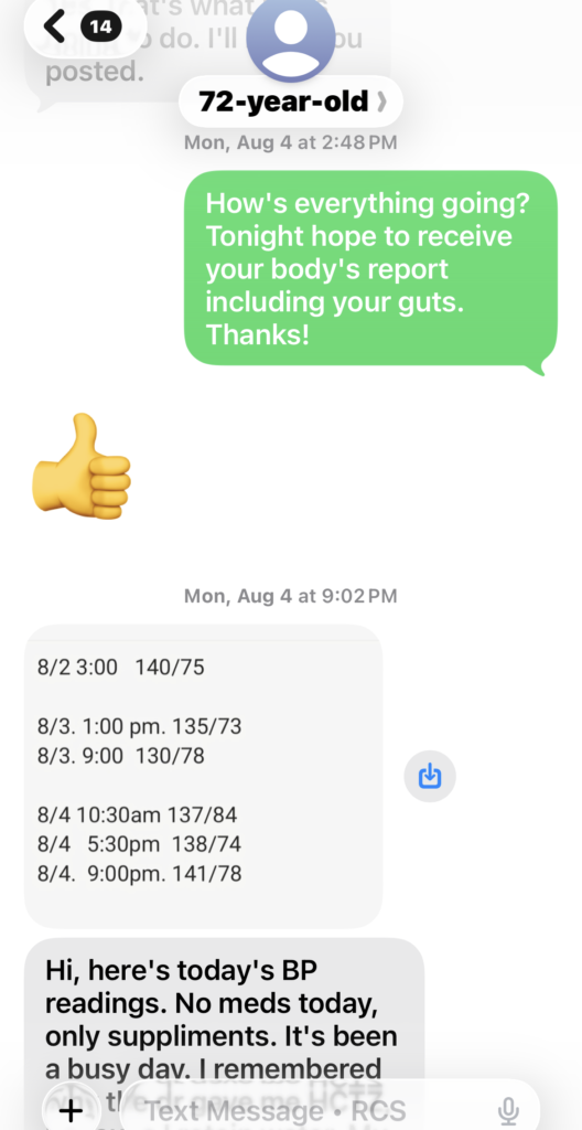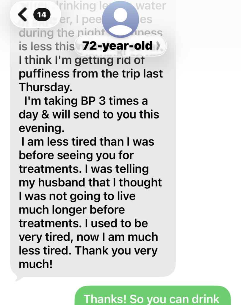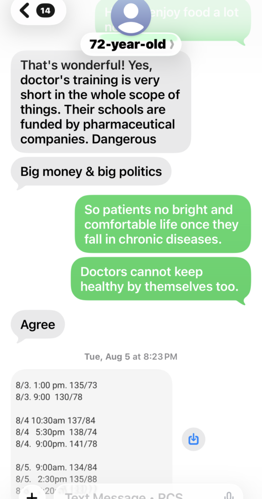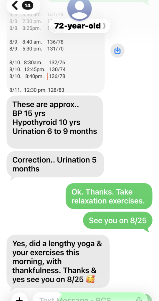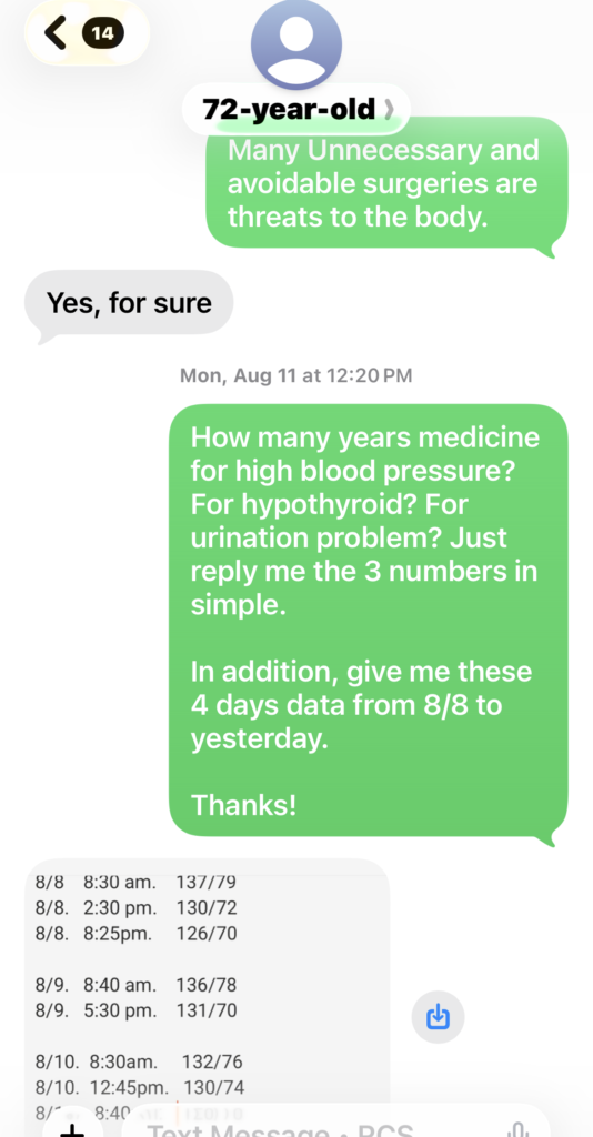 In July, 2025, she was still taking high blood pressure medicine, unable to stop it and had been taking that medicine HCTZ for over 15 years. Even with the medicine, her blood pressure sometimes was still high above normal level. We both think it was the side effect of the diuretics medicine finally made her suffering from uncontrollable embarrassing frequent urination problem as well. From the blood pressure data in Aug., 2025, you can see how her body tried to heal her out from high blood pressure with the help of our lights therapy. Soon after the program started, she had found no more hot flashes.
