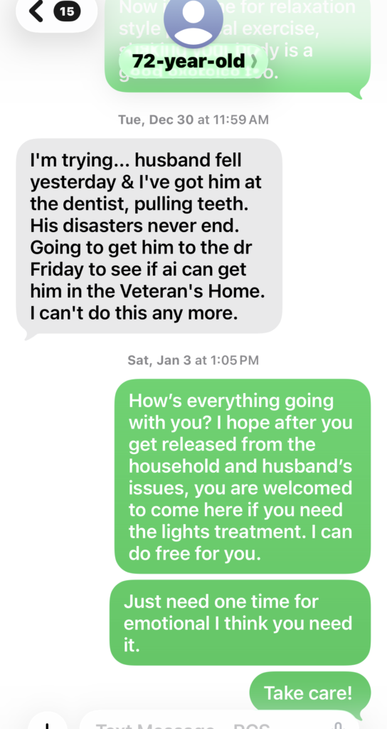 Despite of lots of stresses in her daily life, with our lights therapy help, her body has overcome several chronic health issues. If she could lead a comfortable life without so many stresses from her family, her body would recover more efficiently. Hope her families especially her sons can understand how hardship their elderly mother is taking and can realize long-time stresses are big killer to the body, they as adults need to learn to take care of themselves and their own families instead of depending on their elderly mother/super mama all the time!